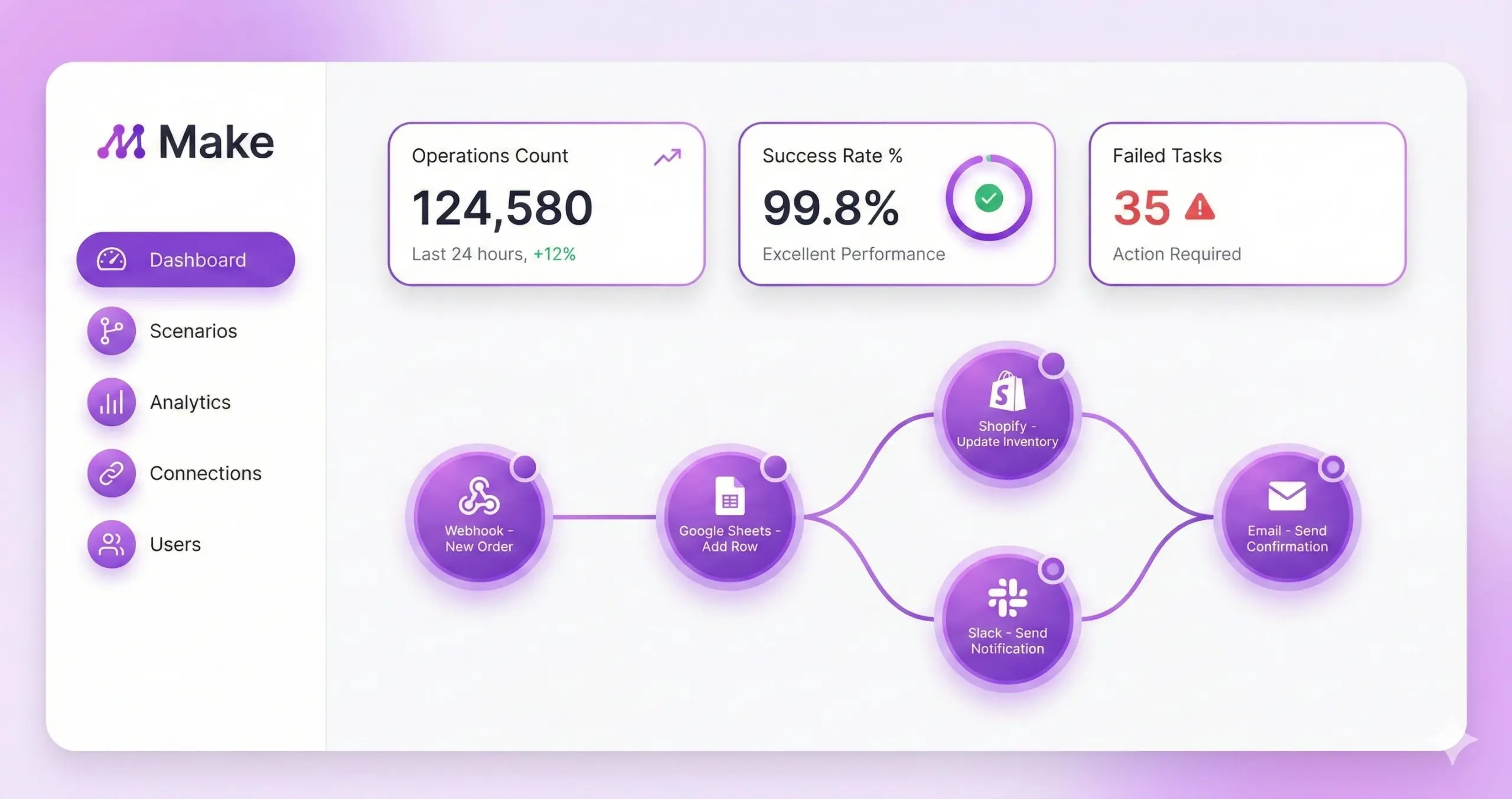 If Zapier is a list, Make is a canvas. This is my personal favorite when I need workflow automation platforms no-code enthusiasts can actually see and understand. Best make automations lets you visualize workflows like a mind map, dragging bubbles around to create logic loops and branches, which makes it easier to understand.